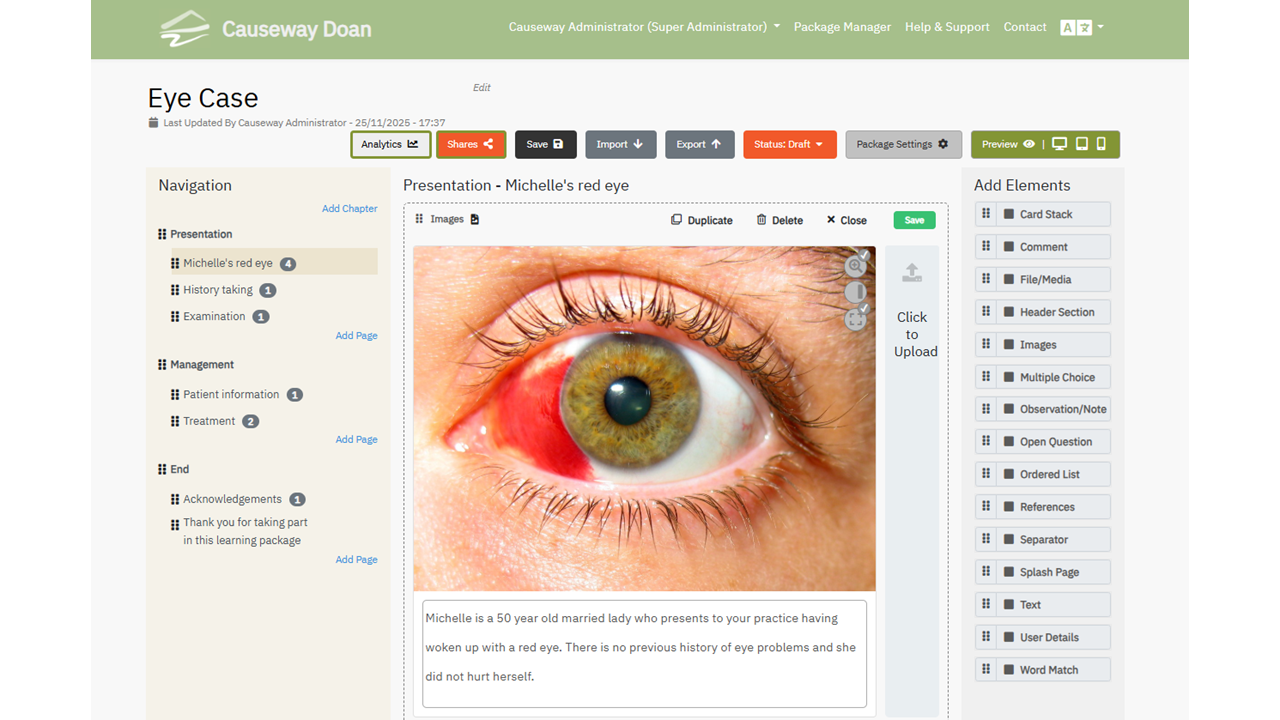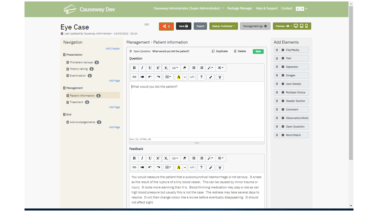 Packages can be exported from the Causeway environment and these exported learning packages can be hosted in other services such as an Learning Management system, such as Moodle or Canvas, or on a Web Server. The SCORM compliant exported content can also be imported into Causeway by other Causeway users