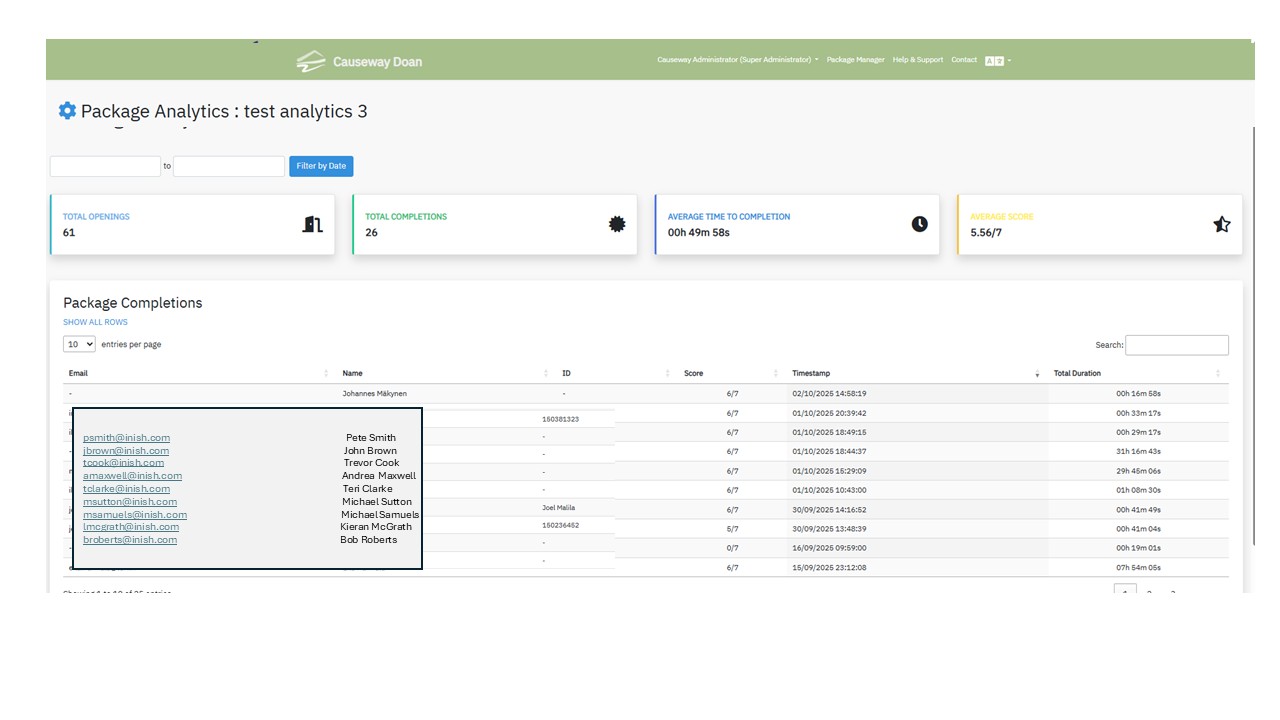 The table displays the data for each completed attempt for each user. Their email address, name and ID is displayed if the author has included the User Details element within the package. In addition the table shows the users score, timestamp when the attempt was made and the time taken to complete the package.